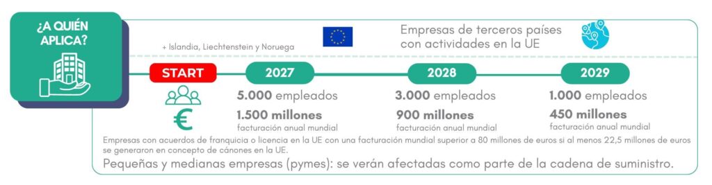 • Empresas de la Unión Europea (más Islandia, Liechtenstein y Noruega) o empresas de terceros países con actividades en la UE*. Aplicará de forma gradual: