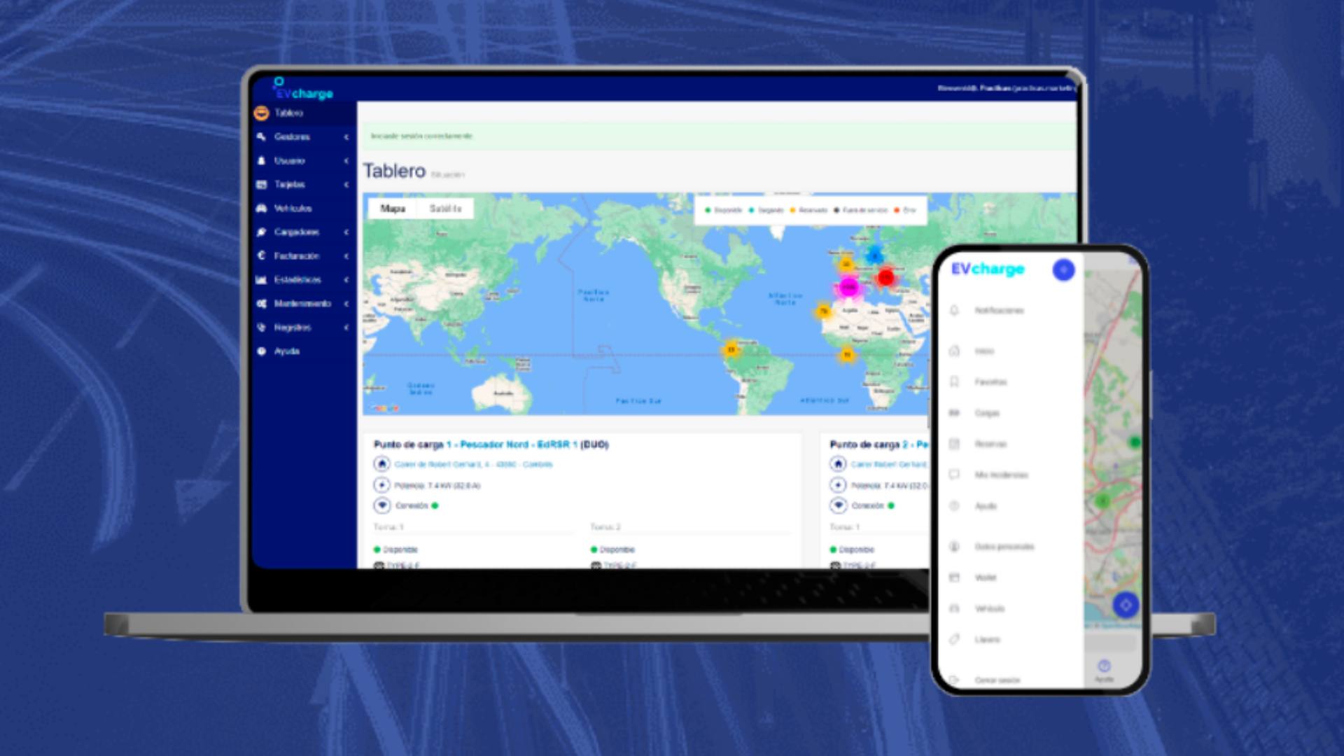 EVcharge es una plataforma SaaS basada en la nube que ofrece el control total sobre los cargadores. Dispone de herramientas de gestión que permiten escalar: optimización de todas las operaciones de seguimiento, tarificación, gestión eficiente de la energía y control remoto de todos los puntos de recarga.